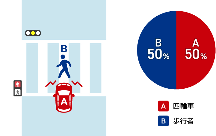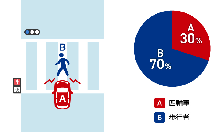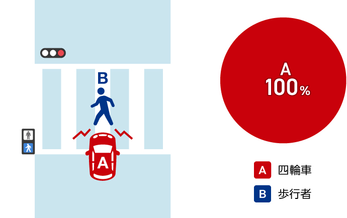 赤信号で進入した車Aと、青信号で横断開始した歩行者Bが衝突した場合