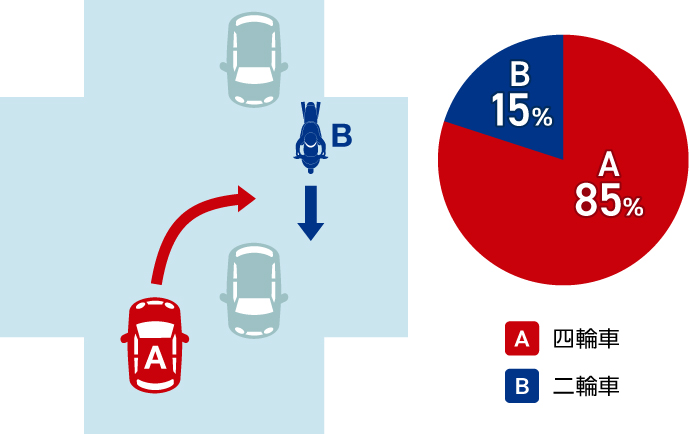 - *二輪車(バイク)側にケガが無い場合は、四輪車同士の事故の過失割合を適用します。