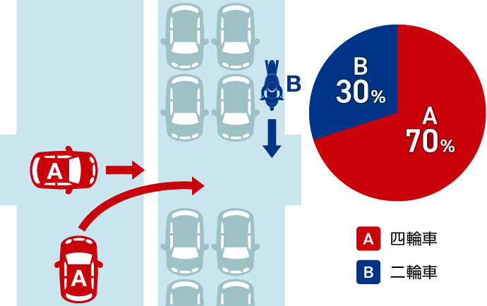 渋滞中、道路から出入りする四輪車Aと直進二輪車Bが衝突した場合