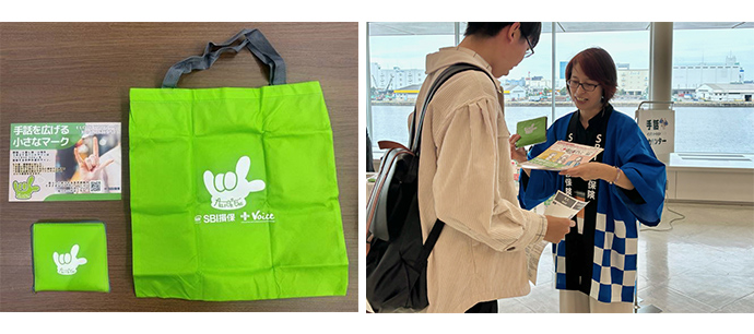 また、SBI損保とプラスヴォイスの協同で、「ろう者・難聴者が音声情報から取り残されてしまう場面」や「ろう者・難聴者とのコミュニケーション方法」について知っていただくための特設Webサイト(https://plusvoice.co.jp/service_kigyo/special-page.php)を作成しました。本イベント会場では、同Webサイトを紹介するチラシや「ろう者・難聴者に支援が必要な時はサポートしたい」という意思表示ができるマークを印字したオリジナルグッズを300名の来場者に配布しました。