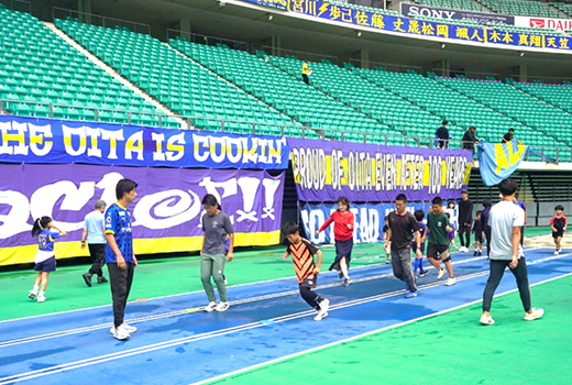 よりスポーツの魅力を感じていただきたいとの思いから、運動教室終了後には、ピッチレベルで選手のウォーミングアップを間近に見学できるツアーを実施し、当日のベガルタ仙台戦の観戦チケットもプレゼントしました。プロの試合前の緊張感を肌で感じていただくとともに、試合をご家族や仲間の皆さんとご一緒に応援をすることによって感動する心や協調性を育む機会としていただきました。