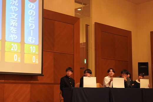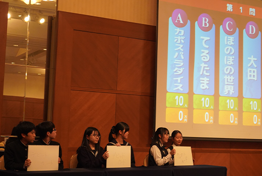 今年は、他校の生徒の皆さんと直接交流することで視野を広げてほしいという思いから、3年ぶりに対面形式による大会を開催いたしました。県内の高校に通う20名の皆さんがそれぞれ2名1チームでエントリーし、税や保険などの金融経済に関する筆記クイズ、早押しクイズなどに挑戦し、上位6チームが決勝ラウンドに進みました。決勝ラウンドはアイドルビジネスをテーマに、各チームがアイドルユニットとして、ファンの数を増やしながら最終的に売上高の大きさを競うゲームを行いました。ボードクイズの形式で行われ、クイズに正解すると、売り上げをとるか、ファンを増やすか、どちらを選択するかを戦略的に考えてもらう内容となっており、各チームはそれぞれ独自の戦略を取りながら熱戦が繰り広げられ、大分県立別府翔青高校のカボスパラダイスチームが見事優勝を勝ち取りました。カボスパラダイスチームのお二人は、2026年2月21日(土)〜22日(日)に東京で開催されるエコノミクス甲子園全国大会において、大分県代表として、各地方大会の優勝チームと戦います。