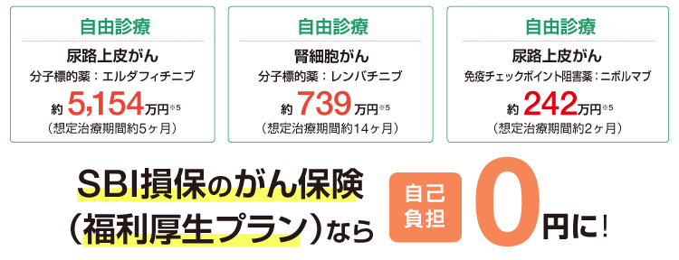 ※5調査機関とSBI損保の調査をもとに算出(5サイクルの参考価格、2020年6月時点)。想定治療期間における薬剤費の概算総額です。実際には患者の体格、症状、投与頻度等により変わります。エルダフィチニブ、ニボルマブの薬剤費は参考価格、レンバチニブは薬価基準によるものです。