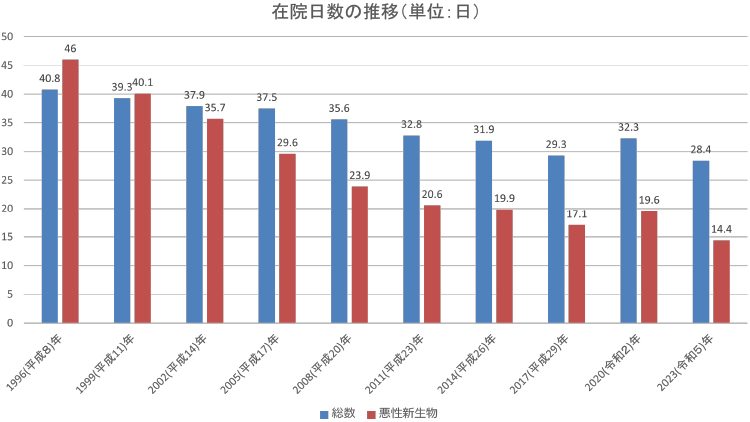 20〜30年前の保険は、長期入院が前提の給付設計でした。しかし今は平均在院日数が大きく短縮され、がん(悪性新生物)といえども、1996年の46日から2023年には14.4日と1/3以下にまで短くなっています(図表1)。